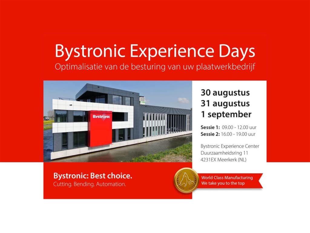 Combineer uw bezoek aan de TechniShow/Esef met een bezoek aan de Bystronic Experience Days van 30 augustus t/m 1 september (09.00-12.00 of 16.00-19.00) bij ons in Meerkerk.